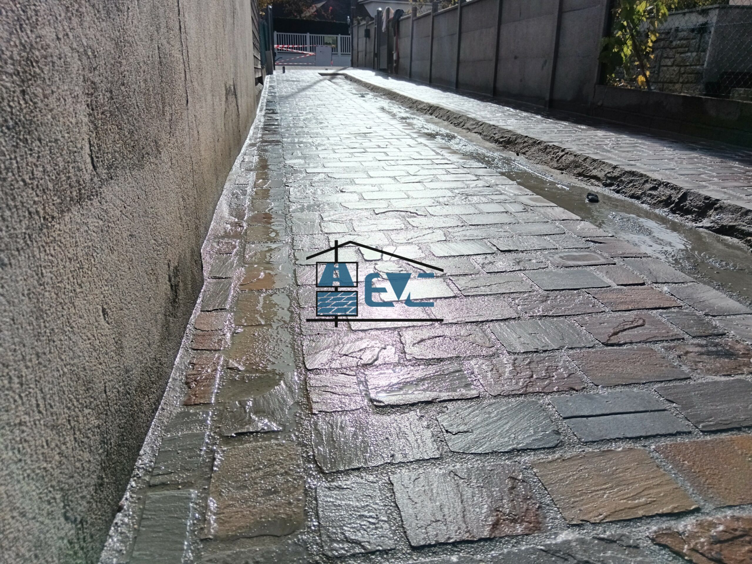 Chaque photo illustre notre allée pavée en grès des Indes à La Norville – réalisation EVC.