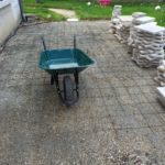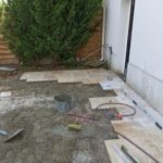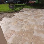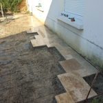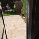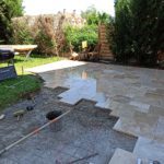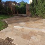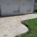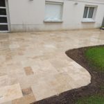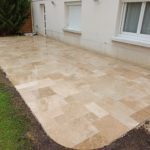 Terrassement et aménagement extérieur d’une terrasse en travertin opus 4 formats dans la commune de La Norville.