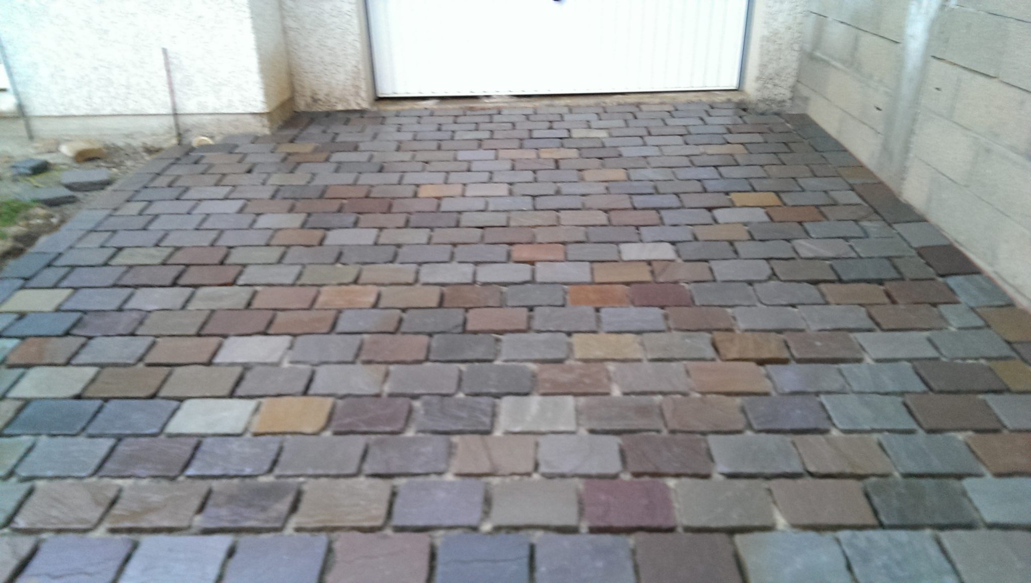 Pose de pavés grès des inde 14X20 couleur ocre ( mélange de couleur ) pour un accès véhicule et piéton.