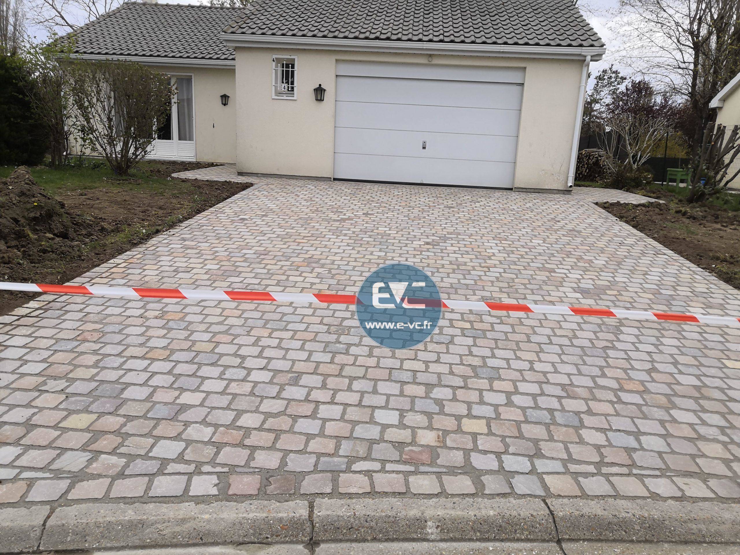 Pose de pierre naturelle grès des inde en 14X14 dans la commune de Mennecy en Essonne 91. Travaux réalisé sur le chantier: Terrassement et évacuation en décharge des gravats…