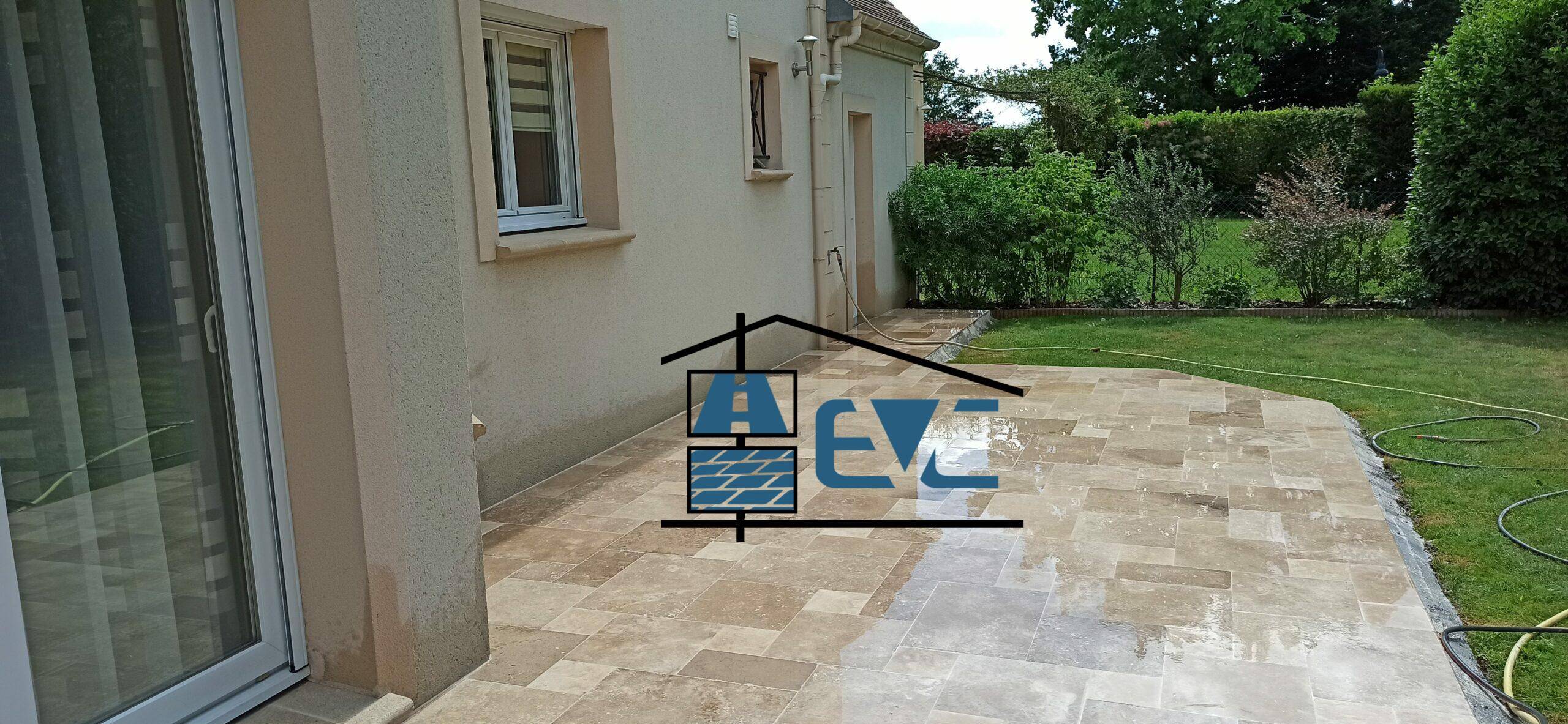 Démolition d'un ancien revêtement et pose d'une terrasse en Travertin Opus 4 formats et chemins d'accès en grès des Inde Blanc Calcaire dans la commune de Nozay. Les travaux qui…