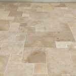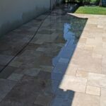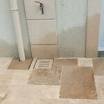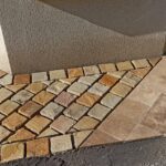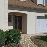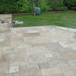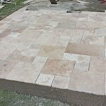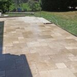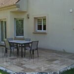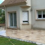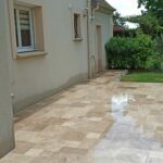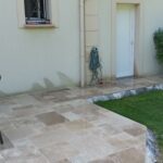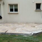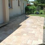 Démolition d’un ancien revêtement et pose d’une terrasse en Travertin Opus 4 formats et chemins d’accès en grès des Inde Blanc Calcaire dans la commune de Nozay.
